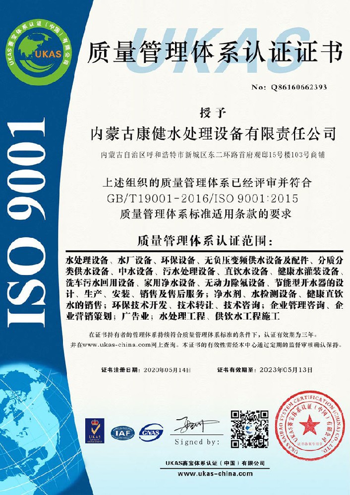 - 內(nèi)蒙古康健水處理設(shè)備有限責(zé)任公司是專業(yè)生產(chǎn)制造水處理設(shè)備、飲料設(shè)備、奶設(shè)備、殺菌設(shè)備、灌裝設(shè)備五大系列90余種配套產(chǎn)品。在反滲透、超濾、納濾、EDI模塊、等膜分離領(lǐng)域有著雄厚的技術(shù)實(shí)力,同時(shí)在水廠設(shè)計(jì)、中水回用、污水處理、分質(zhì)供水、無負(fù)壓變頻供水、鍋爐軟化水設(shè)備等領(lǐng)域有完善的技術(shù)團(tuán)隊(duì)和營銷網(wǎng)絡(luò)。公司坐落在遼闊大草原上美麗的首府——呼和浩特,是內(nèi)蒙古自治區(qū)唯一一家具有自主生產(chǎn)能力的企業(yè)。 “上善若水,水利萬物而不爭”康健水工自成立以來,始終堅(jiān)持“改善水質(zhì)、造福人類、服務(wù)社會、產(chǎn)業(yè)報(bào)國”的企業(yè)信條,以致力于開創(chuàng)人類綠色健康生活為己任,秉承“關(guān)愛生命、責(zé)任至上”的企業(yè)宗旨,成就了享譽(yù)四方的國內(nèi)知名水處理企業(yè)。 水是生命的源泉、工業(yè)的血液、城市的命脈。水是不可替代的寶貴資源。節(jié)約用水,關(guān)注點(diǎn)滴 為節(jié)約水資源貢獻(xiàn)一份力量, 健康飲水,利在當(dāng)代,功在千秋! 只有在這里,才能領(lǐng)會水的精髓;只有在這里,才...